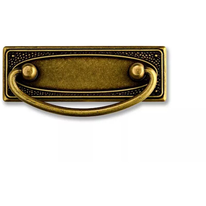 Maniglia per mobile in ottone interasse mm.64,ingombro mm.97x33. Finitura ottone antico.