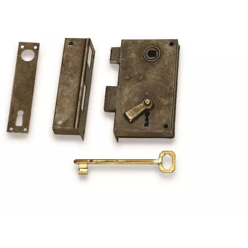 Serratura per porta interna da applicare a redosso a scatola in ferro completa di chiave e riscontro. Entrata mm.45 Q.8. Versione destra.
