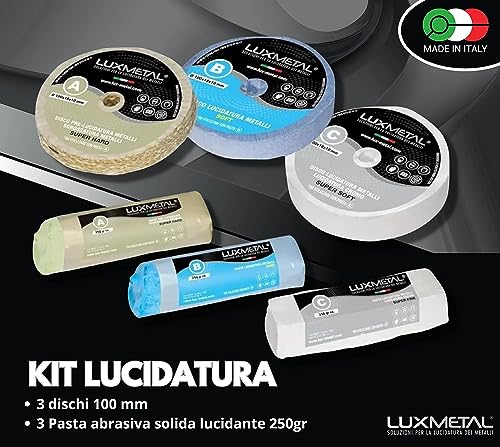 Lux Metal - Kit Lucidatura con 3 dischi lucidanti 100 mm e 3 paste abrasive 250 grammi - Ideali per lucidare metalli come Alluminio,Ferro,Acciaio Inox,Ottone,Bronzo,Rame,Argento,Oro,Legno,Plastica