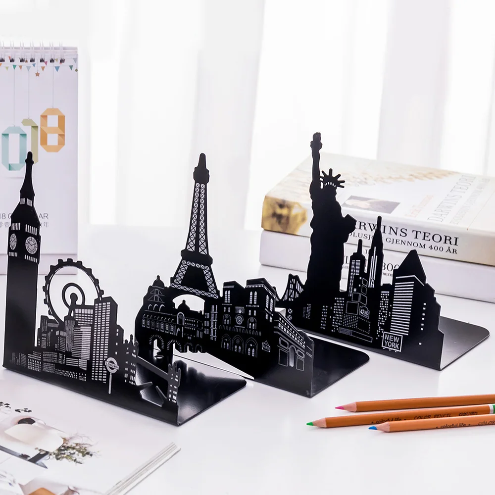 1 Pair Metal Desk Book Storage Rack Bookends Heavy Duty Stretch Wrought Iron Book Stand Creative Book Block Hollow Book Organize