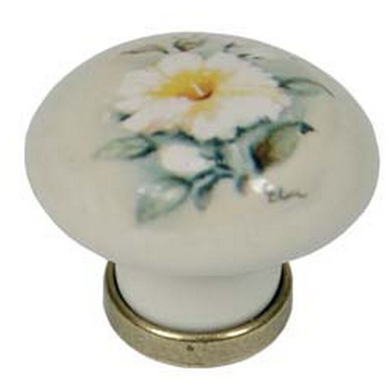 Pomolo tondo in porcellana colore avorio con giglio - base ottone anticato