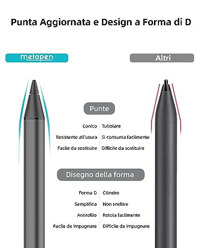 ✍ [Punta avanzata e sensazione premium] Il design aerodinamico e il corpo in alluminio conferiscono a Metapen G1 un aspetto più attraente. Corpo della penna dal design ergonomico per una sensazione eccellente. Il design del corpo della penna a forma di D lo rende più facile da impugnare e non facile da rotolare via. Beneficiando del design avanzato della punta simile a un mais, il segnale è più convergente rispetto al pennino tubolare e l'offset del cursore è più impercettibile.