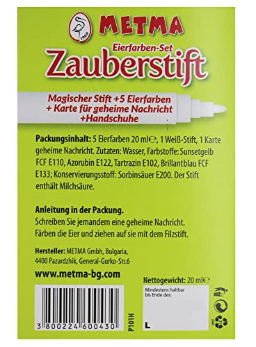 Metma P-101 - Colori, 5 Pezzi, Giallo, Arancione, Rosso, Blu, Verde, Penna Magica, Biglietto per messaggi Segreti, Guanti, vassoi Colorati, Uova, Pasqua, Multicolore