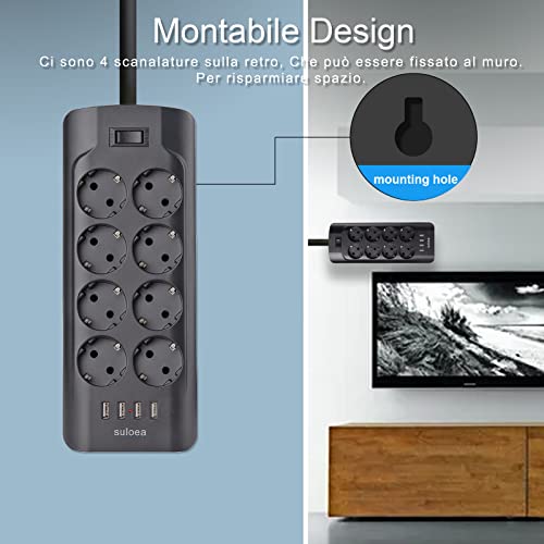 2 Metri Ciabatta Multipresa Elettrica con USB,8 Prese e 4 Porte USB Presa Multipla Montabile,Protezione Sovraccarico e Sovratensione,3000W/13A