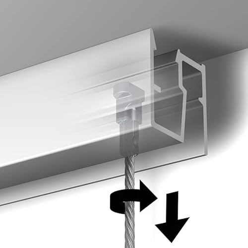 Questo set di 40 metri cimaise Newly R40 di colore bianco (può essere verniciato) include: 20 guide da 200 cm, 120 clip di fissaggio per soffitto, 120 viti, 120 tasselli, 25 cavi perlon twister da 150 cm, 25 ganci classici autobloccanti Artiteq e 15 punte di finitura.
