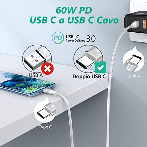 Cavo USB C USB C 2 Metri,60W Cavo Type-c to Type-c 3A PD Ricarica Rapida USBC Caricatore Tipo C a USB-C Cavetto Nylon Cavi con Macbook Air/Pro, iPad Pro, Samsung Galaxy S22 S21 Note, Huawei, Switch