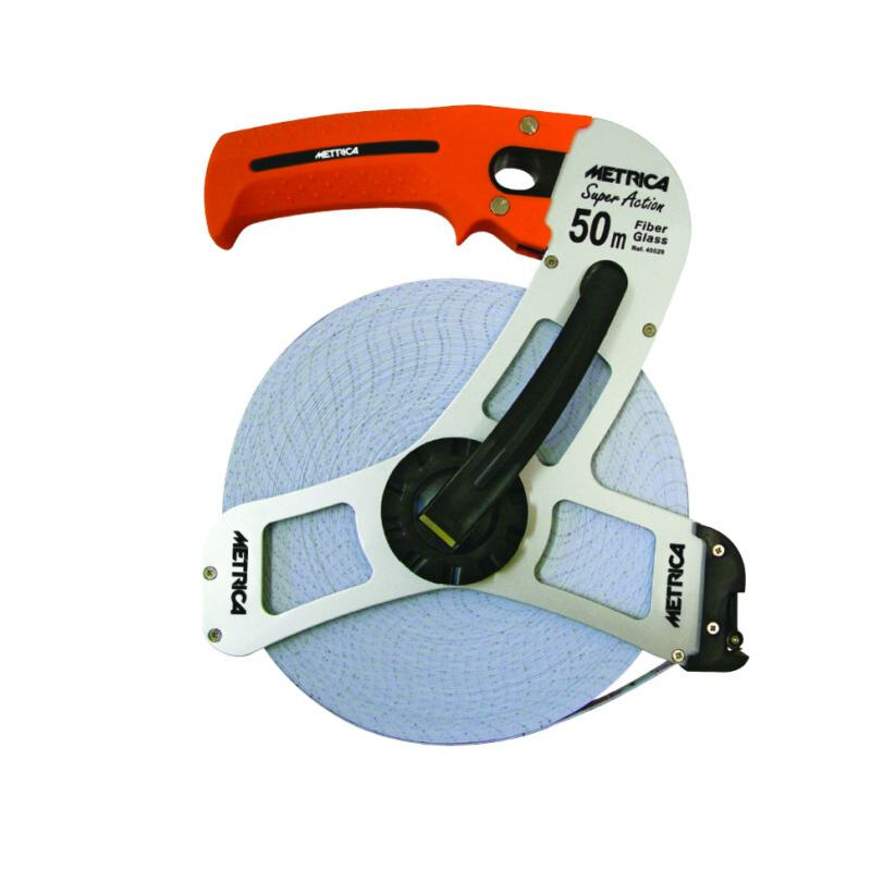 Nastro in fibra di vetro Forma ergonomica brevettata Questo modello non stanca il polso durante l'uso e trasporto Esclusivo sistema di uscita del nastro a 3 velocità manovella bloccata Gancio Quadrato all'inizio per fissare il nastro Manico gommato con rivestimento antiscivolo speciale Valigia trasparente