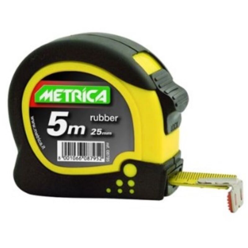 Flessometro METRICA modello Rubber Touch MT 5 X 25 MM con speciale gancio mobile, rivestito all'interno con gomma alettata che facilita e aumenta la presa . Il Nastro è protetto con speciale rivestimento in nylon, di lunga durata, antiabrasione, antiacido ed antiriflesso . Numerazione gigante per una lettura facilitata Cassa con superficie rivestita in gomma antiscivolo, bloccaggio a scatto e rientro automatico, con ammortizzatore . Clip nella parte retro per permettere all'utente di avere sempre a portata di mano il flessometro Rubber