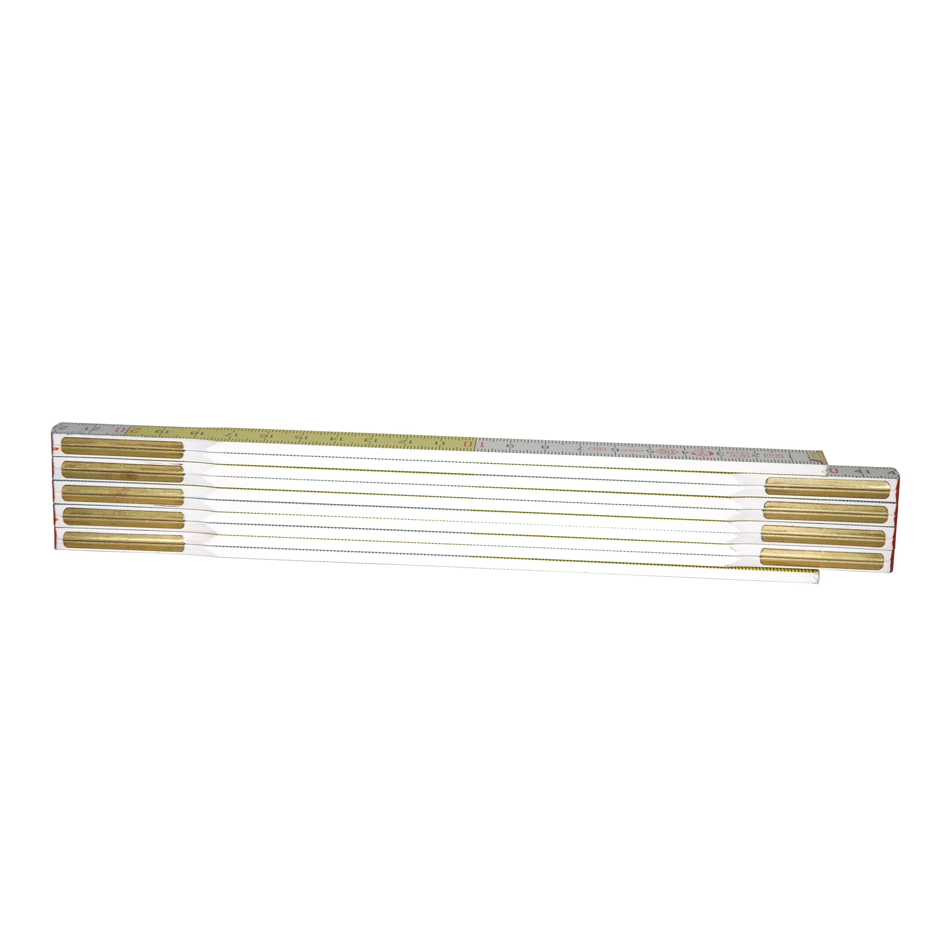 Metro pieghevole in legno, lunghezza 2 m, larghezza 16 mm. Superficie con finitura multistrato, rivestimento UV, nessun rivetto a vista. Resistente alle abrasioni, estremità fresate.. Classe di precisione III. Fissaggio delle stecche in ottone.