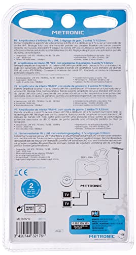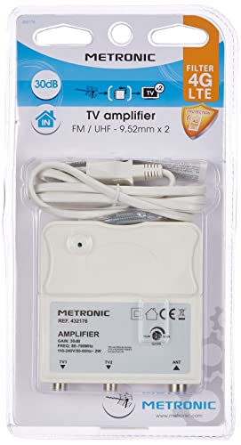 Metronic 432176 - Amplificatore da interno con regolazione di guadagno FM-UHF, guadagno regolabile fino a 30 dB, protezione 4G, prese TV, diametro 9,52 mm, colore: Bianco