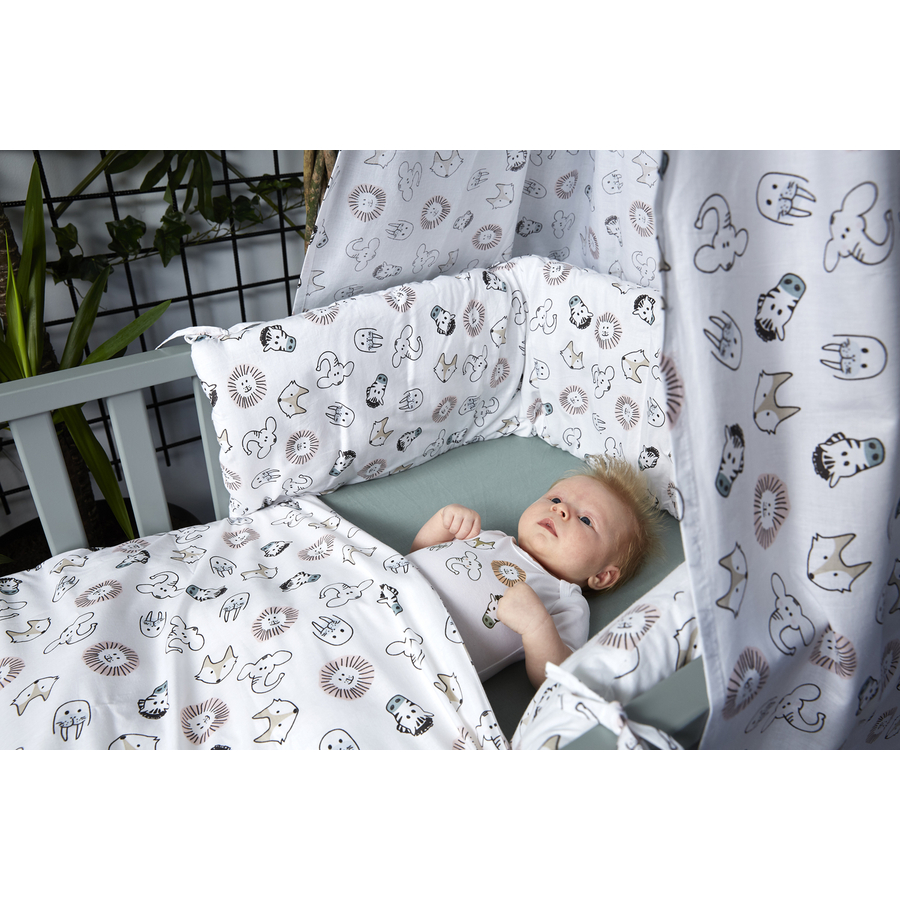 Dettagli del prodotto: Set per bambini da 4 pezzi Adatto per un lettino Composto da un copripiumino 100x135 cm, una federa 40x60 cm, un copritesta e un baldacchino 100% cotone per il massimo comfort Copritesta in 100% cotone con imbottitura in 100% poliestere Materiale e cura: 100% cotone Imbottitura in poliestere Lavabile in lavatrice Adatto all'asciugatura in asciugatrice Non utilizzare la copertina decorativa per i bambini di età inferiore ai 2 anni (accumulo di calore e rischio di soffocamento). Dimensioni e peso: Copripiumino: 100x135 cm Federa: 40x60 cm Larghezza dell'imballaggio: 327 mm Altezza dell'imballaggio: 138 mm Lunghezza imballo: 390 mm La consegna include: Copripiumino, federa, copritesta, baldacchino Attenzione: la fornitura non comprende la struttura del letto.