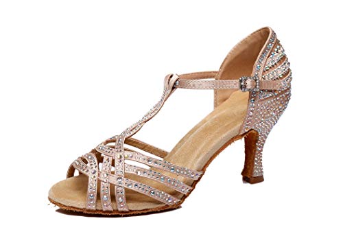 MGM-Joymod - Sandali da donna con tacco svasato e cinturino a T, con strass, per salsa, tango latino, Beige (Beige/7.5cm Heel), 36 EU