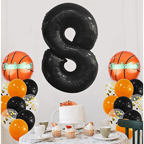 MiaLover Grande palloncino da basket, decorazione per compleanno, 8 anni, decorazione per il compleanno dei bambini, numero 8, palloncini, arancione, nero, festa a tema, decorazione di compleanno
