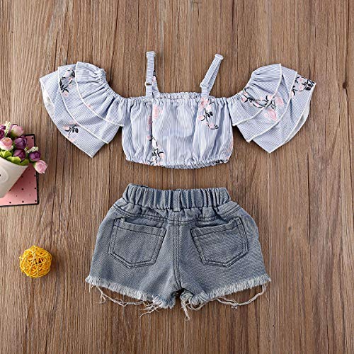 Miaouyo Set di Abbigliamento Estivo per Neonate Top Corto con Spalle Scoperte e Volant Floreale + Pantaloncini di Jeans (Blu, 6-12 M)