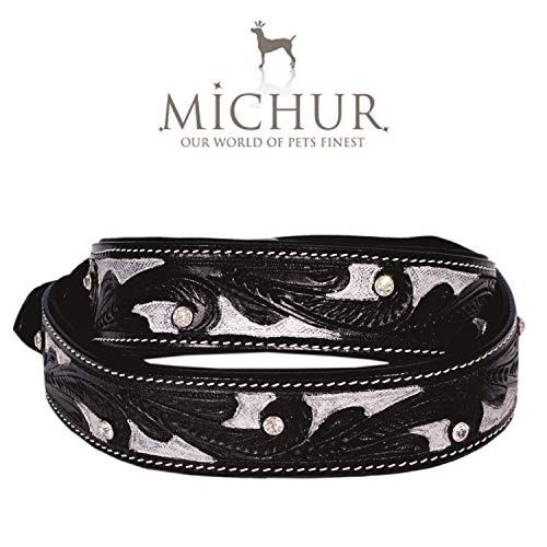 Il collare Michur morbido e resistente è realizzato in vera pelle. Collare cuoio cane, Modello del collare in pelle: Alfredo Nero con disegno floreale stampato e strass con una lunghezza totale di 55 cm ed una larghezza di 3,9 cm è adatto ad una circonferenza del collo di 41 - 49 cm. Il guinzaglio abbinato di Michur è disponibile separatamente.
