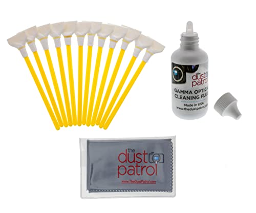 Micro-Tools Kit per la pulizia del CCD delle fotocamere digitali. Tra cui 12 x The Dust Patrol Sensor Cleaning Swabs tamponi di pulizia del sensore Full Frame 24mm (giallo). Compresa The Dust Patrol Gamma 59ml Bottiglia di liquido detergente. Supplementare di un The Dust Patrol micro fibra panno.