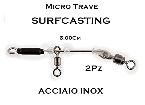 Micro trave da competizione surfcasting. Costruito in acciaio inox. Consente di effettuare lunghissimi lanci e riduce al minimo i grovigli. Doppia girella rolling e sistema di aggancio / sgancio rapido del piombo.