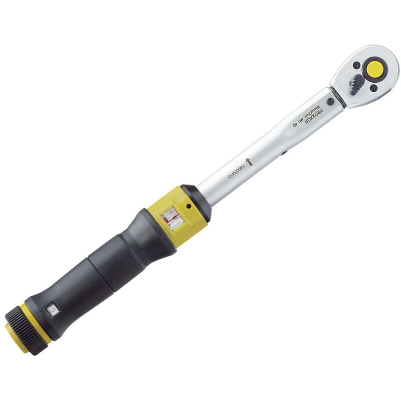 CHIAVE DINAMOMETRICA PROXXON MICROCLICK MC 60, con valori di coppia da 12 a 60 Nm. Con attacco quadro da 3/8 (10 mm). Lunghezza totale 370 mm. Utensile di elevata precisione (tolleranza secondo le norme ISO 6789 +/- 3%). Singolarmente calibrate e collaudate. Con certificato delle prove. Meccanismo di cricco con inversione da destra a sinistra. Disinnesto breve automatico: Si avvert e si sente chiaramente un segnale di click quando si raggiunge il valore di coppia preselezionato. Pratico meccanismo di sblocco delle bussole: la bussola ha una tenuta tenace e si libera facilmente premendo il pulsante. Leva di inversione da rotazione destrorsa e sinistrorsa. Stabile leva in acciaio ovale. Ottimale protezione contro la ruggine: nichelata 2 volte e poi cromata opaca. Numero seriale durevolmente marcato al laser per una sicura identificazione. Scala graduata analogica ben leggibile per una precisa impostazione del valore di coppia preselezionato. Manopola ergonomica che si impugna