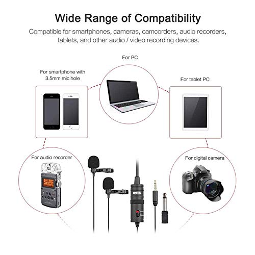 Prestazioni perfette: il nostro microfono doppio lavalier ha soddisfatto le esigenze di due persone che registrano contemporaneamente. Microfono omnidirezionale! raccoglie tutto il suono da tutte le direzioni. Cavo ultra lungo da 237 pollici. adatto per un certo grado di registrazione a lunga distanza