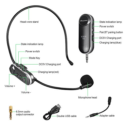 Microfono Archetto UHF, Mbuynow Microfono Wireless Professionale 2,4 GHz con Ricevitore Bluetooth e Convertitore 6,5 mm Jack Audio per Presentazione, Discorso, Guida Turistica, Karaoke, Lezione ecc