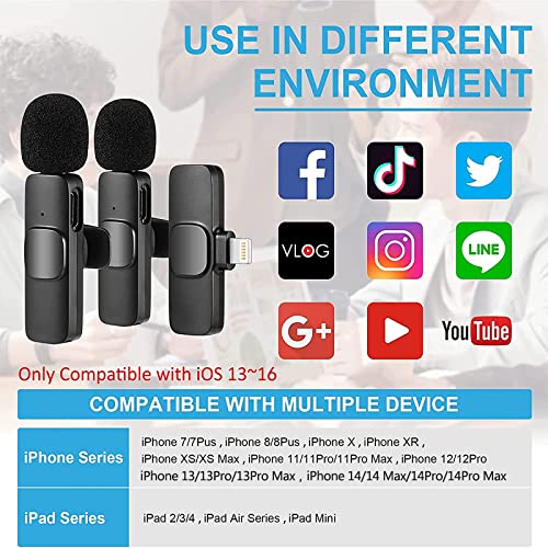 Compatibile con iPhone/iPad: il nostro microfono lavalier wireless può funzionare con iPhone 7/7 Plus, 8/8 Plus, X/XR/XS/XS Max, 11/11 Pro/11 Pro Max, 12/12 Pro//12 Pro Max, 13/13 Pro/13 Pro Max, 14/14 Pro/14 Pro Max e iPad 2/3/4, serie iPad Air, iPad Pro serie. es (NOTA: l'ultima versione di iPad Pro da 11 pollici e 12,9 pollici con porta di tipo C non supportata).