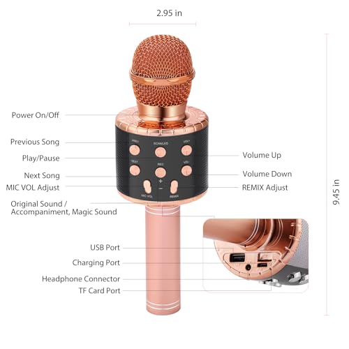 【3 in 1 Microfono Karaoke Portatile】: Grazie alla sua leggerezza, potrai portarlo ovunque tu voglia, senza dover andare in cerca di una sala Karaoke. E' anche l'altoparlante Bluetooth, si può essere usato come microfono wireless, Hi-Fi Bluetooth. Puoi anche usarlo per registrare le sue canzoni nell'App sul cellulare.