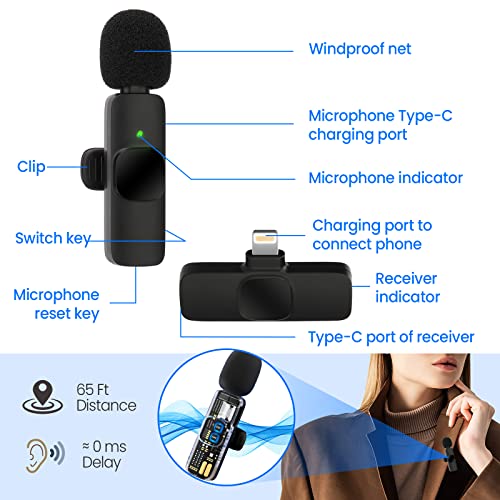 Microfono Lavalier Wireless per iPhone - Professionale Microfoni Senza Fili con 2 Trasmettitori e 1 Ricevitore 2.4GHz Mini Mic per Youtube, Video Tiktok, Facebook Live Stream, Vlog