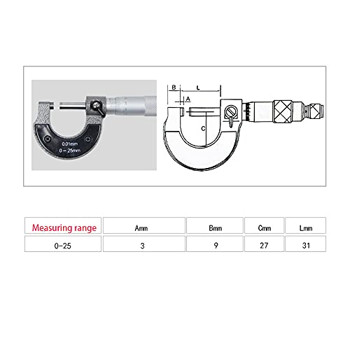 La gamma del micrometro: 0-25 mm, la risoluzione: 0,01 mm.