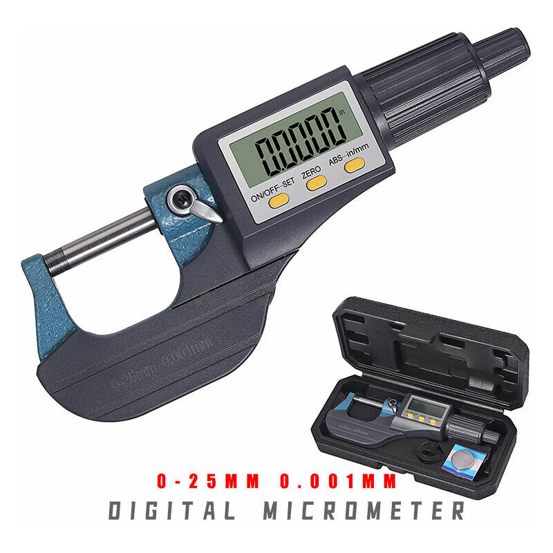 Micrometro elettronico Micrometro Micrometro per spessore parete Micrometro digitale 0-25 mm 0,001 mm Intervallo di misurazione: intervallo di misurazione ampio 0-25 mm (1) e risoluzione 0,001 mm (0,00005). Diametro albero: 6,5 mm, acciaio inossidabile temprato. Display LCD: display digitale elettronico LCD, di facile lettura. Batteria a bottone 3V: batteria al litio CR2032 di grande capacità, resistente e sicura. Usi: conversione da mm a pollici, azzeramento per ogni misura, misure incrementali o assolute. Istruzioni: OnOff...Set: interruttore e manopola di impostazione. Premere brevemente il pulsante per accendere e spegnere la macchina e premere a lungo il pulsante per reimpostare su 0.25,50.75. Tenere premuto per visualizzare alternativamente più valori zero. Se viene visualizzato uno degli zeri, rilasciare il pulsante. Il valore zero è il valore attualmente visualizzato. Ripristino: premere il pulsante. I dati sono valori iniziali standard (0,25,50,75). ABS...in mm/pollici