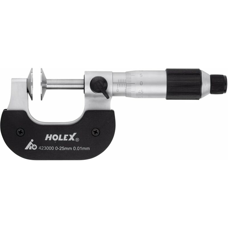 Con piattelli temprati di grandi dimensioni. Arco in acciaio forgiato e verniciato. Esecuzione con stelo rotante. Uso: Per la misura degli ingranaggi a partire dal modulo 0,8. Fornitura: A partire da Dim. 25-50 inclusa 1 asta di regolazione. Dati tecnici Imballaggio Custodia rigida Norma DIN 863 Metrologia analogico Tipo di prodotto Micrometro Lettura, mm 0,01 Intervallo di misurazione, mm 0 - 25 Taratura B1 Passo vite angolare, mm 0,5 Scala tamburo graduato, mm 1/50 ⌀ Stelo, mm 8 Parallelismo delle superfici di contatto, µm 5 ⌀ Piattello, mm 20
