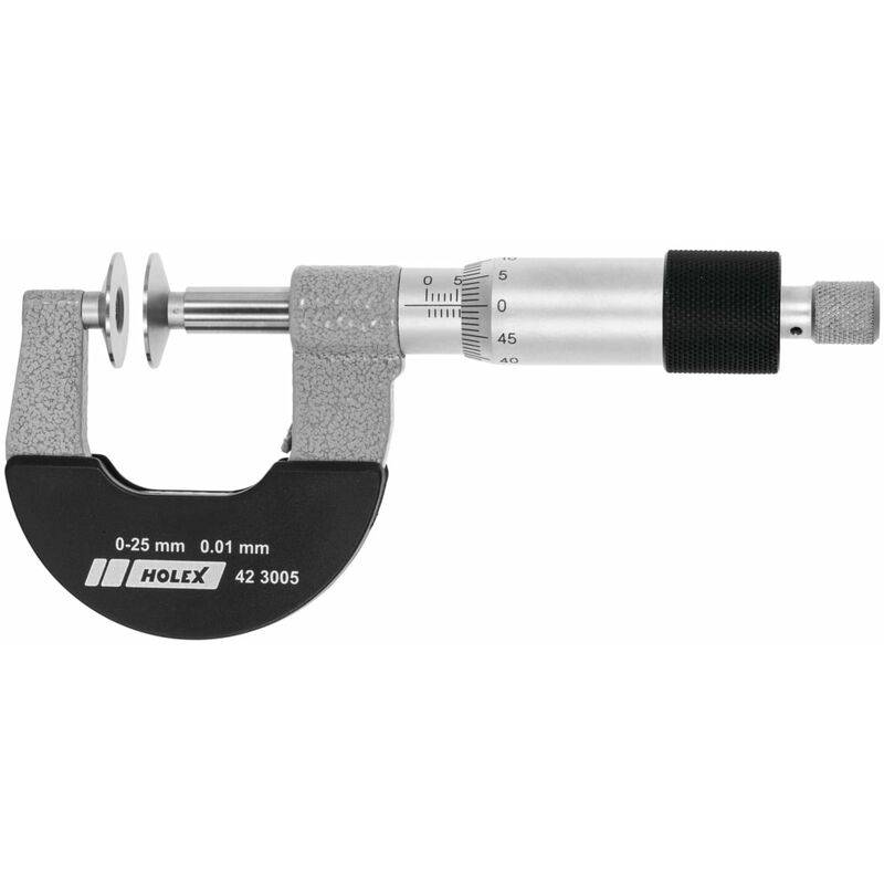 Con piattelli temprati di grandi dimensioni. Arco in acciaio forgiato e verniciato. Esecuzione con mandrino non rotante. Uso: Per la misura degli ingranaggi a partire dal modulo 0,8. Fornitura: A partire da Dim. 25-50 inclusa 1 asta di regolazione. Dati tecnici Metrologia analogico Imballaggio Custodia rigida Tipo di prodotto Micrometro Norma DIN 863 Lettura, mm 0,01 Intervallo di misurazione, mm 0 - 25 Taratura B1 Passo vite angolare, mm 0,5 Scala tamburo graduato, mm 1/50 ⌀ Stelo, mm 8 Parallelismo delle superfici di contatto, µm 5 ⌀ Piattello, mm 19,5