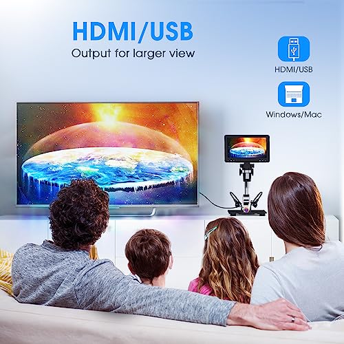 【Connessione HDMI/USB】: Microscopio da 7 pollici può essere facilmente collegato a qualsiasi monitor o PC con interfaccia HDMI, è possibile utilizzare un cavo USB per collegare il microscopio al computer, supportare l'installazione di una scheda Micro SD da 32 GB, osservare le immagini e i video ottenuti durante il processo possono essere salvati direttamente sulla scheda SD.