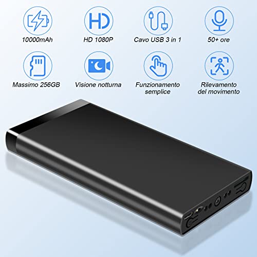 【10000mAh & 50 Ore】La batteria integrata di mini telecamera spia nascosta ha una grande capacità di 10000mAh. Dopo una carica completa, mini telecamera 1080P può lavorare ininterrottamente per 50 ore (registrazione video). Microcamera spia invisibile è molto adatto alle persone che hanno bisogno di uscire, perché queste persone hanno un'elevata richiesta di ricarica tempestiva, in particolare coloro che svolgono spesso attività all'aperto o viaggi di lavoro