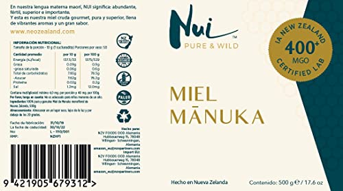 NUI Pure & Wild miele di manuka MGO 400+(UMF 13+)/ dalla Nuova Zelanda/garantito genuino/certificato / 500g