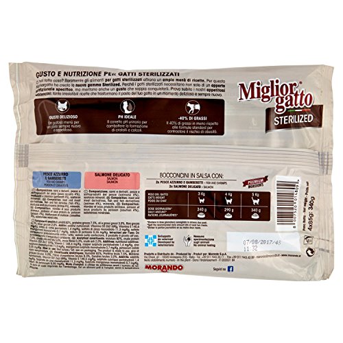 MigliorGatto Sterilized Bocconcini pesce in gelatina (Salmone delicato e Pesce Azz. e Gamb) multipack 12 x 340 Grammi
