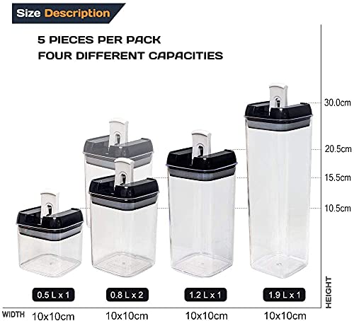 Soluzioni multiuso: il set include 5 contenitori in quattro dimensioni: 1 mini contenitori (2,1 tazze/0,5 litri), 2 contenitori piccoli (3,4 tazze/0,8 litri), 1 contenitore medio (5,1 tazze/1,2 litri), 1 grande Contenitori (8,0 tazze/1,9 litri). Il grande contenitore può facilmente contenere spaghetti alti e tagliatelle. I contenitori di diverse dimensioni consentono una varietà di opzioni di conservazione.
