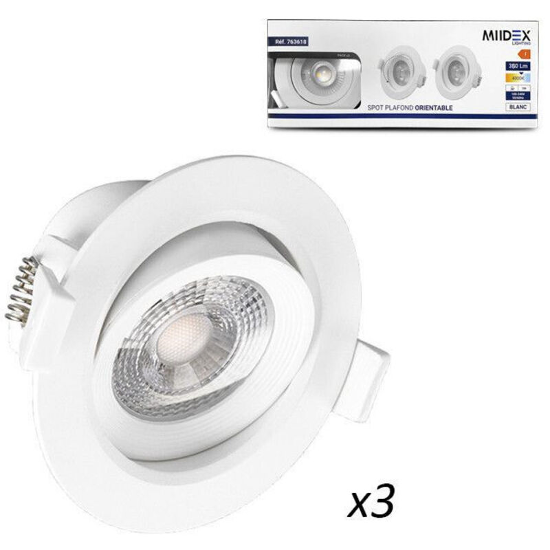Pack pratique de 3 spots - : Questo pacchetto comprende 3 punti LED da incasso orientabili, che permettono di godere di illuminazione uniforme e regolabile in diverse parti della vostra scelta. [Éclairage performant]: I punti funzionano con una tensione di 220/240V AC, offrendo compatibilità con la maggior parte delle installazioni elettriche. Con un consumo di soli 5W per posto, sono anche efficienti dal punto di vista energetico. [Lumière vive]: Le macchie producono un'ombra di luce bianca naturale (4000K) che offre un'atmosfera neutra e piacevole. Con un flusso luminoso di 350 lumen per posto, forniscono luce e sufficiente illuminazione per illuminare efficacemente le vostre parti. [Résistance et dimensions pratiques]: I punti sono classificati IP20 per la protezione contro le intrusioni solide del corpo con un indice IK03 per la resistenza agli urti. Con un diametro di 90mm e un'altezza di 45mm, sono compatti e facili da installare in aree recesse con un diametro di 68mm. 4000K