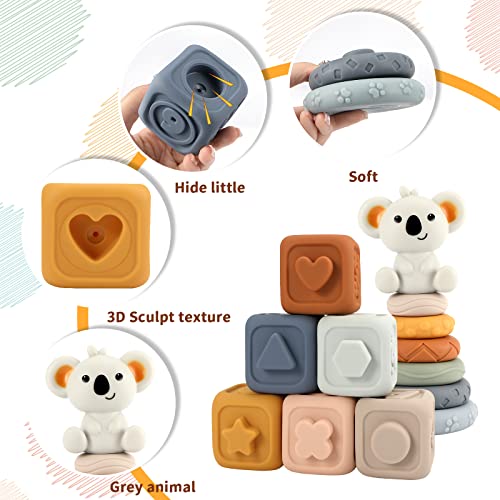Piccola sorpresa: un set di 1 koala + 6 anelli in gomma morbida + 6 quadrati in gomma morbida, per soddisfare il gioco quotidiano del bambino, spremere i giocattoli per bambini sul bordo inferiore di ogni cerchio morbido si trova un piccolo foro, un suono sonoro quando i bambini premono i morbidi anelli impilabili. e migliora la sensibilità del bambino.