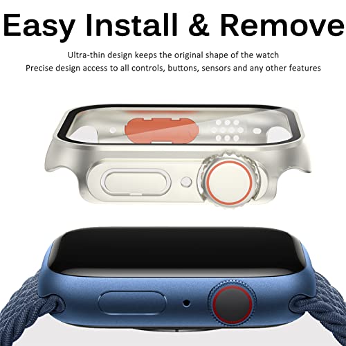 [Protezione completa] La custodia per Apple Watch è realizzata in telaio rigido in PC e pellicola protettiva in vetro temperato trasparente, può proteggere lo schermo del tuo Apple Watch e i bordi curvi da graffi, urti e cadute accidentali e senza aggiungere ingombro.