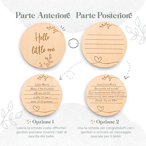 CONFEZIONE REGALO: idea regalo neonata femmina o maschio, perfetta per baby shower o battesimo: arriva in una confezione regalo accattivante, sulla quale è possibile scrivere il nome del bimbo o dei genitori. Contiene milestone card in legno con “Hello little one” su un lato e spazio per un messaggio sull'altro.