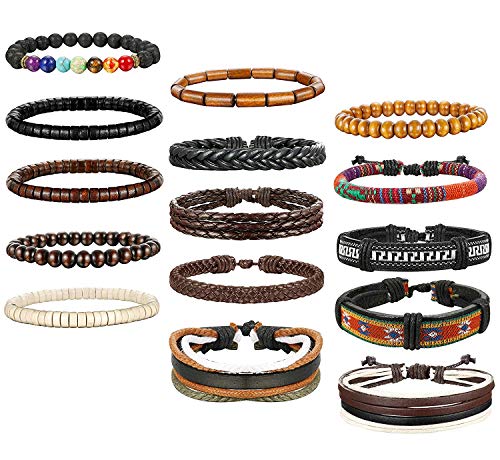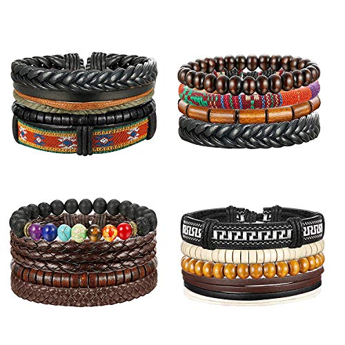 Milacolato 8-15Pcs Bracciali in pelle per uomo Cordini di canapa Perline in legno Bracciali tribali etnici Bracciali in pelle