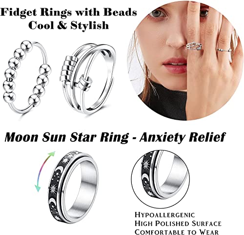 Milacolato 8 Pezzi Anelli Fidget in Acciaio Inossidabile per Donna Uomo Anelli Spinner con Perline Luna Stella Sole Anelli Set Taglia 22