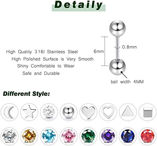 Milacolato16Pairs 20G Piercing Orecchio in Acciaio Inossidabile Piercing Trago Cartilagine Orecchini Brillantini Set per Donna Helix Trago Conch CZ Orecchini Set Piercing Plugs Gioielli palla indietro