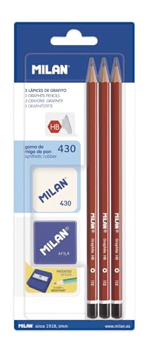 Milan bym10016 - Blister con 3 matite grafite, temperino e gomma da cancellare, 5 Pezzi