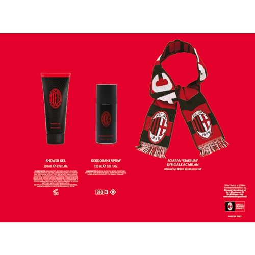 CONFEZIONE: Confezione Regalo Uomo, deodorante Spray 150 ml + Shower Gel 200 ml + sciarpa Ufficiale AC Milan Il regalo perfetto. Cofanetto Regalo Uomo, Deodorante Spray 150 ml + Shower Gel 200 ml. Utile e profumato, deodorante e docciaschiuma perfetti in ogni occasione, con il profumo intenso e sofisticato di Milan.