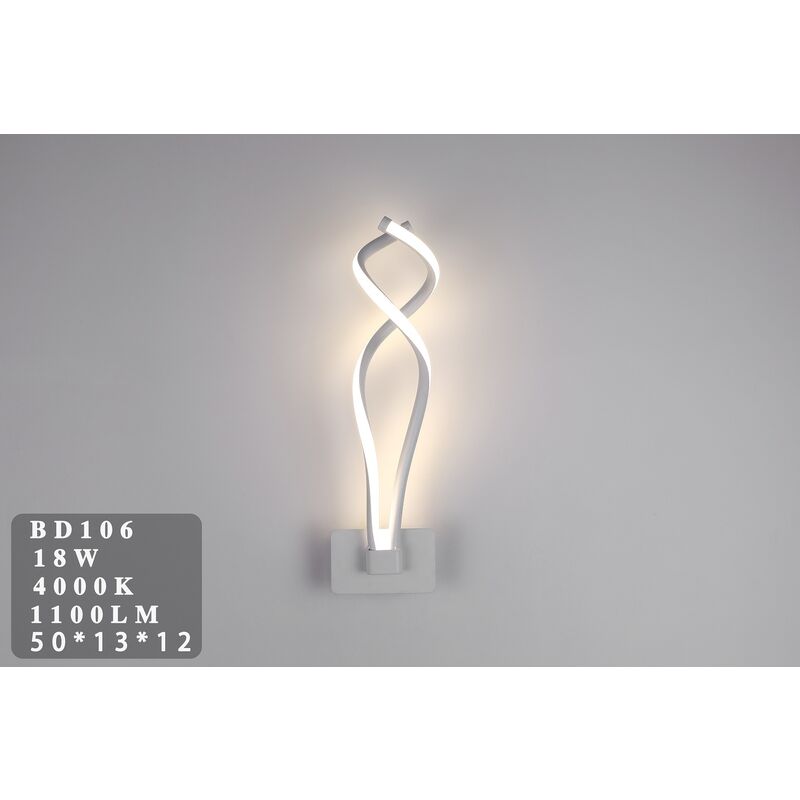 Applique da parete moderno e sofisticato con illuminazione led integrato. Forma dinamica a spirale, ideale per corridoi, camere da letto, salotti, uffici, ristoranti, ecc. Caratteristiche tecniche Potenza 18W Flusso luminoso 1100lm Colore corpo Bianco Voltaggio AC180-265V Frequenza 50/60Hz Dimmerabile No Uso Interno Luce 4000k naturale Materiale Metallo + Acrilico Dimensioni Larghezza 130 mm Altezza 500 mm