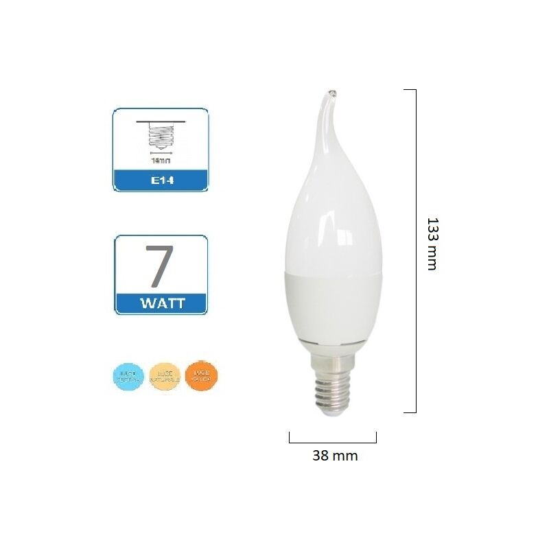 Lampadina Candela Satinata LED 7W E14 220V-240V Specifiche Tecniche Generali Attacco E14 Tipo Lampada Lampadina Tipo LED SMD Vita media 25 000h Specifiche per modello Potenza 7W Potenza Equivalente **** Flusso Luminoso (Lumen) 700 Altezza (mm) 133 Diametro (mm) 38 Tensione AC: 220-240V Frequenza 50/60Hz Colore della luce Caldo Naturale Freddo Temperatura di colore 3000K 4500K 6500K Materiale Plastica Colore Bianco Dimmerabile No