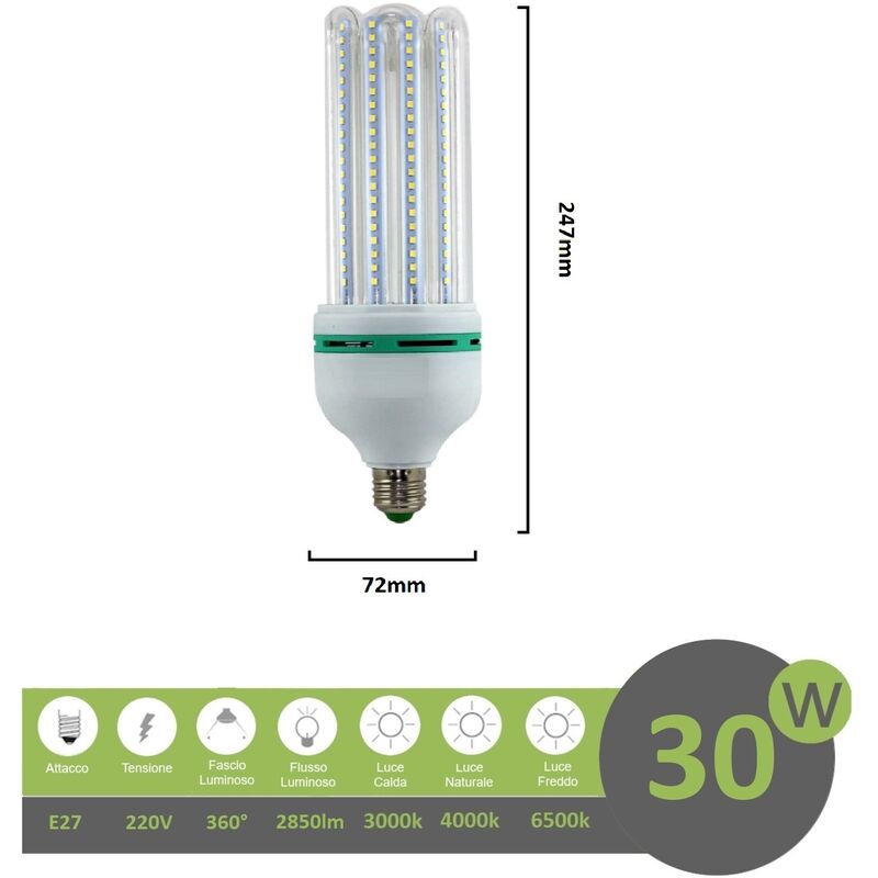 Le lampadine con illuminazione led sono valide sostitute di quelle alogene, permettono una massima resa luminosa con basso consumo energetico. Design dinamico e compatto adatto per tutte le esigenze con attacco E27. Caratteristiche tecniche Modello Tubolare Tensione nominale 220V Energia 30W Attacco E27 Luce disponibile 6500k-4000K-3000k Flusso luminoso 2850lm Vita media 30000h Dimmerabile No Dimensioni Altezza 247 mm Diametro 72 mm