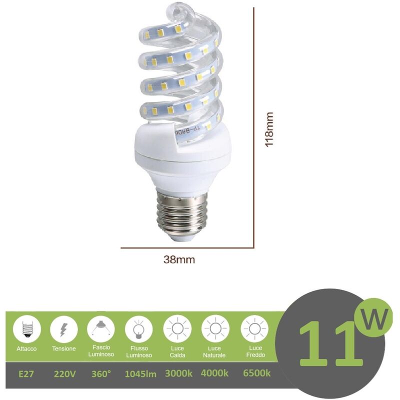 Le lampadine con illuminazione led sono valide sostitute di quelle alogene, permettono una massima resa luminosa con basso consumo energetico. Design dinamico e compatto adatto per tutte le esigenze con attacco E27. Caratteristiche tecniche Modello Spirale Tensione nominale 220V Energia 11W Attacco E27 Luce disponibile 6500k-4000K-3000k Flusso luminoso 1045lm Vita media 30000h Dimmerabile No Dimensioni Altezza 118 mm Diametro 38 mm