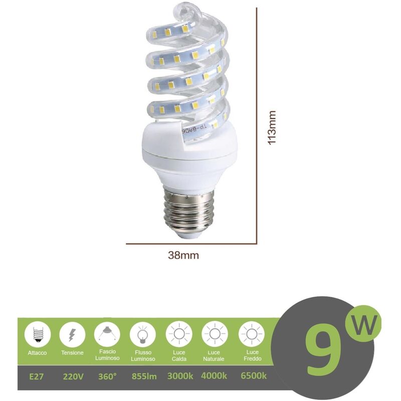 Le lampadine con illuminazione led sono valide sostitute di quelle alogene, permettono una massima resa luminosa con basso consumo energetico. Design dinamico e compatto adatto per tutte le esigenze con attacco E14. Caratteristiche tecniche Modello Spirale Tensione nominale 220V Energia 9W Attacco E27 Luce disponibile 6500k-4000K-3000k Flusso luminoso 665lm Vita media 30000h Dimmerabile No Dimensioni Altezza 113 mm Diametro 38 mm